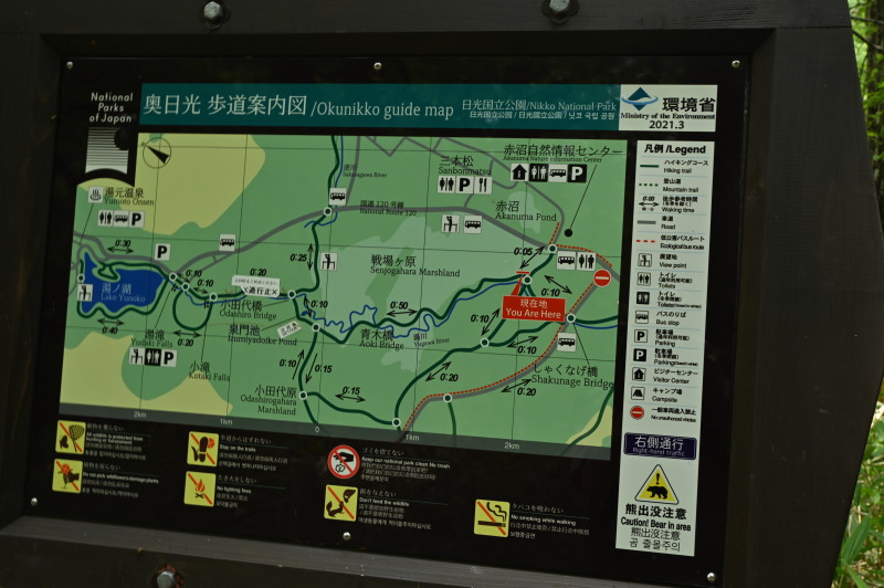 赤沼の駐車場が空いているか気になりましたが、今回は空いていなくても待つ覚悟で、来てもいつも満車状態で戦場ヶ原のハイキングコースを歩けなかったので、今回は湿原に入りたい歩きたい思いが強く、そして幸い普通車の駐車場は「空」のランプが点灯していてすぐに入ることができました(そのご満車に)。